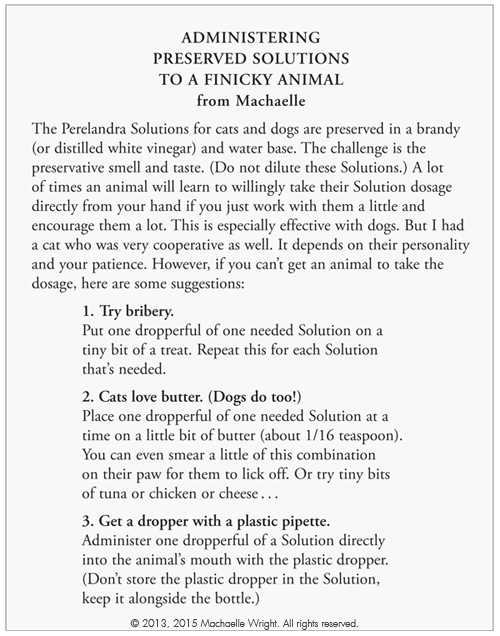 It's not just cats that can be a challenge when administering essences and Solutions. Machaelle gives excellent tips for finicky animals in the Dog and Cat Health Combo brochures: